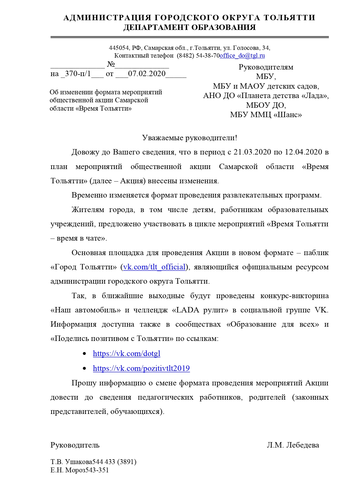 öåëÿõ ïðîôåññèîíàëüíîãî îáñóæäåíèÿ àêòóàëüíûõ âîïðîñîâ îáðàçîâàíèÿ, îðãàíèçàöèè ðàáîòû ñèñòåìû îáðàçîâàíèÿ ã.î. Òîëüÿòòè â 2020-2021 ó÷.ãîäó ñ 24 ïî 30 àâãóñòà ïðîâîäèòñÿ öèêë ìåðîïðèÿòèé â ðàìêàõ Àâãóñòîâñêîé êîíôåðåíöèè ðàáîòíèêîâ îáðàçîâàíèÿ ãîðîäñêîãî îêðóãà Òîëüÿòòè 2020 ãîäà.